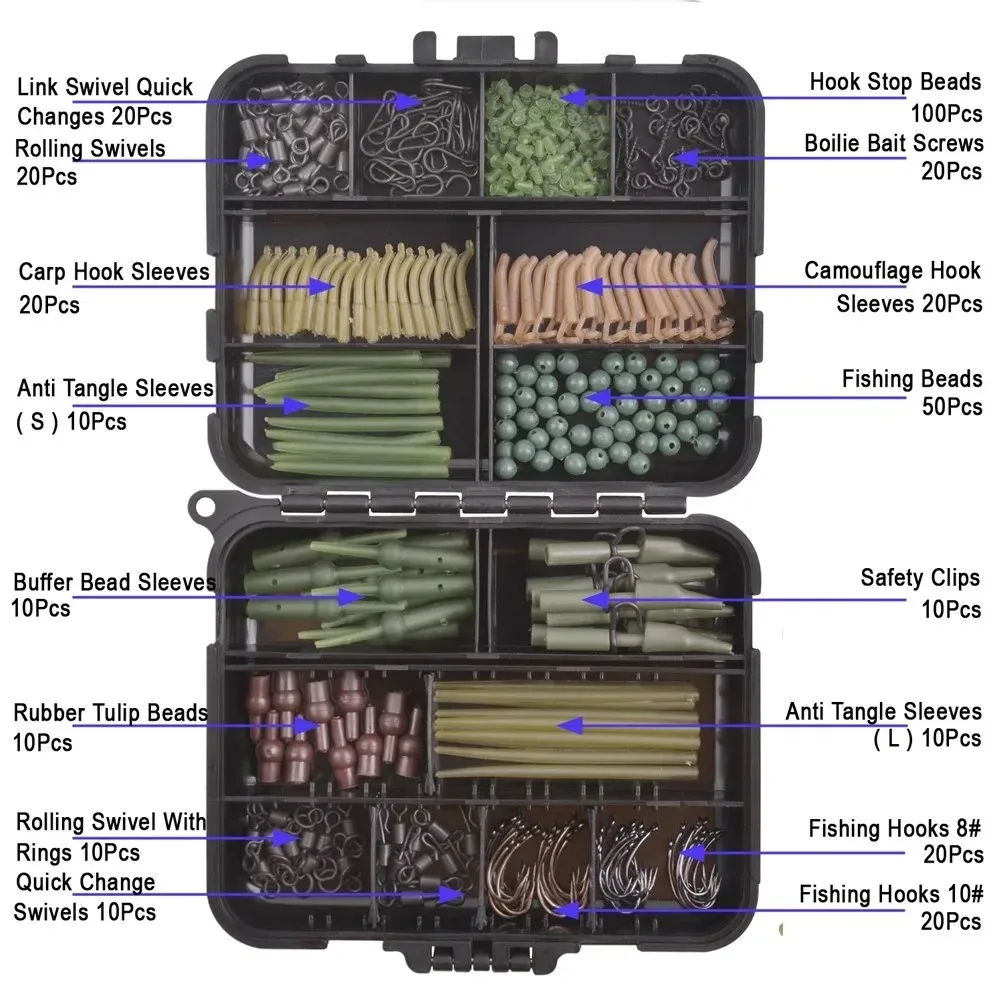 360Pcs Carp Fishing Accessories Tackle Kit Carp Hooks Quick Change Swivels Anti-Tangle Sleeves for Carp Fishing Hair Rig