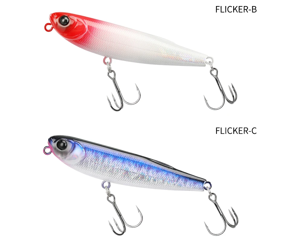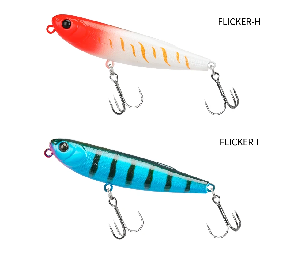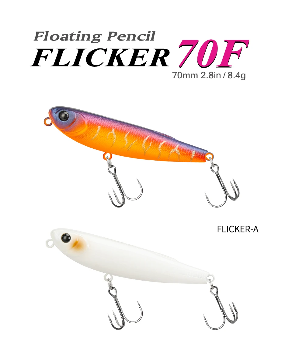 • FLICKER, a 70mm pencil, mixes natural slides with a nimble dog walking rhythm. It has explosive power for topwater game such as seabass, bream and trevally