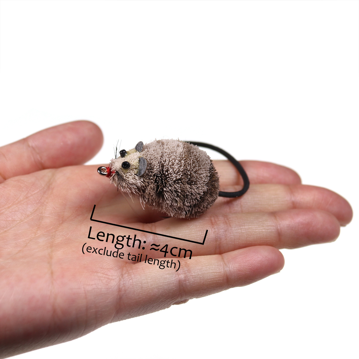 Mouse fly: size 2/0, soft rubber tail, trimmed deer hair body. very realistic looking surface fly pattern.