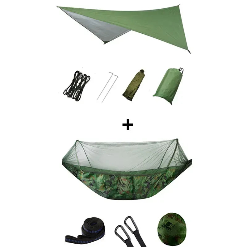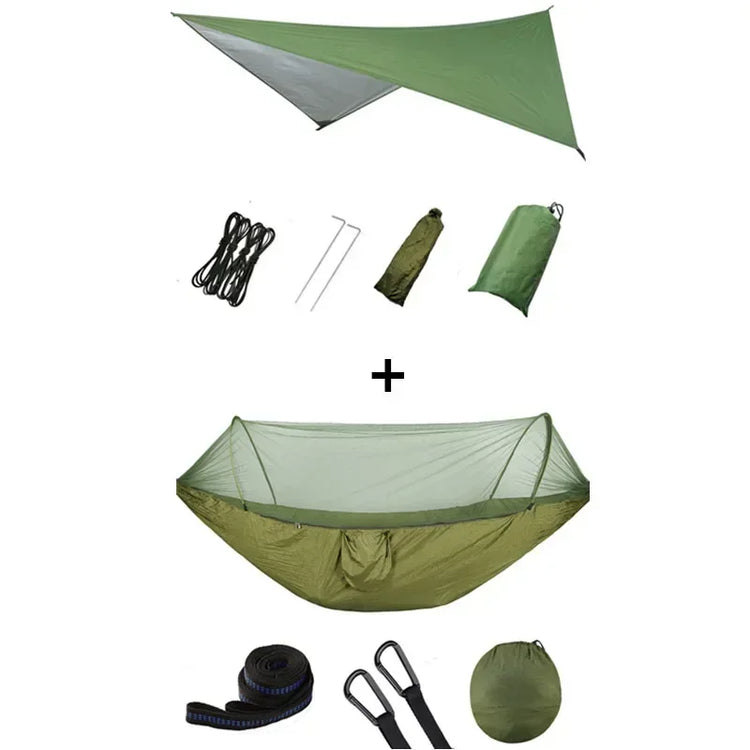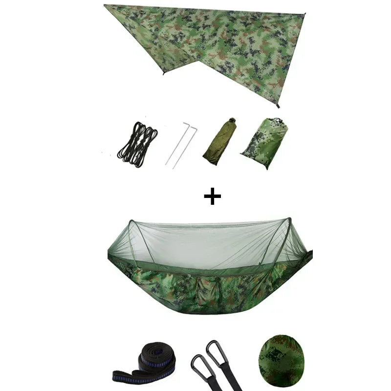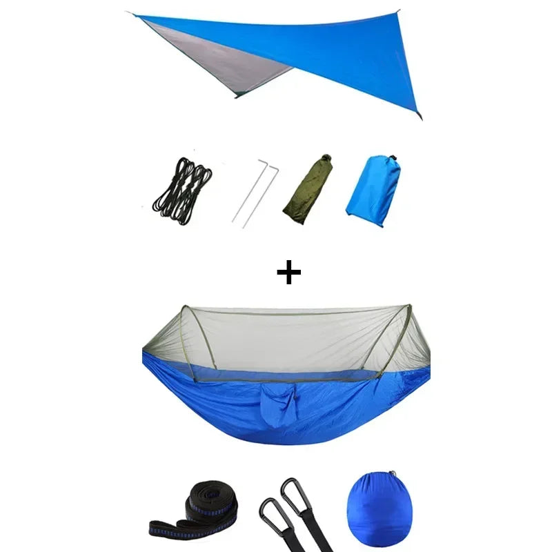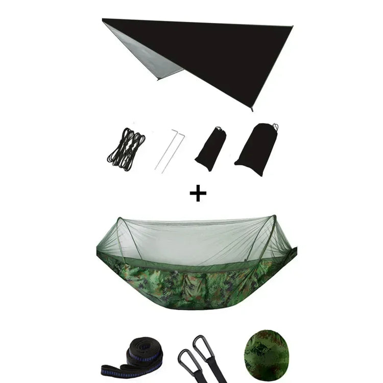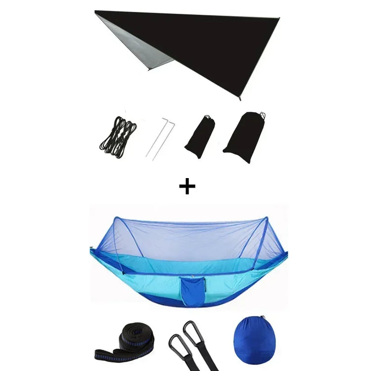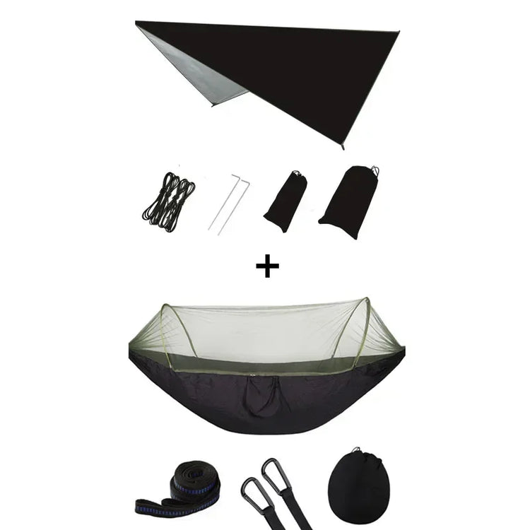 First of all, I can tell you with certainty that this camping hammock is made up of two main members: a hammock and a parasol.When strong sunlight comes, you can set the sky to avoid strong ultraviolet radiation. When the sudden heavy rain comes, you can quickly set the sky, so you can avoid rain, of course, the sky can also be removed and then come to the local pad!
