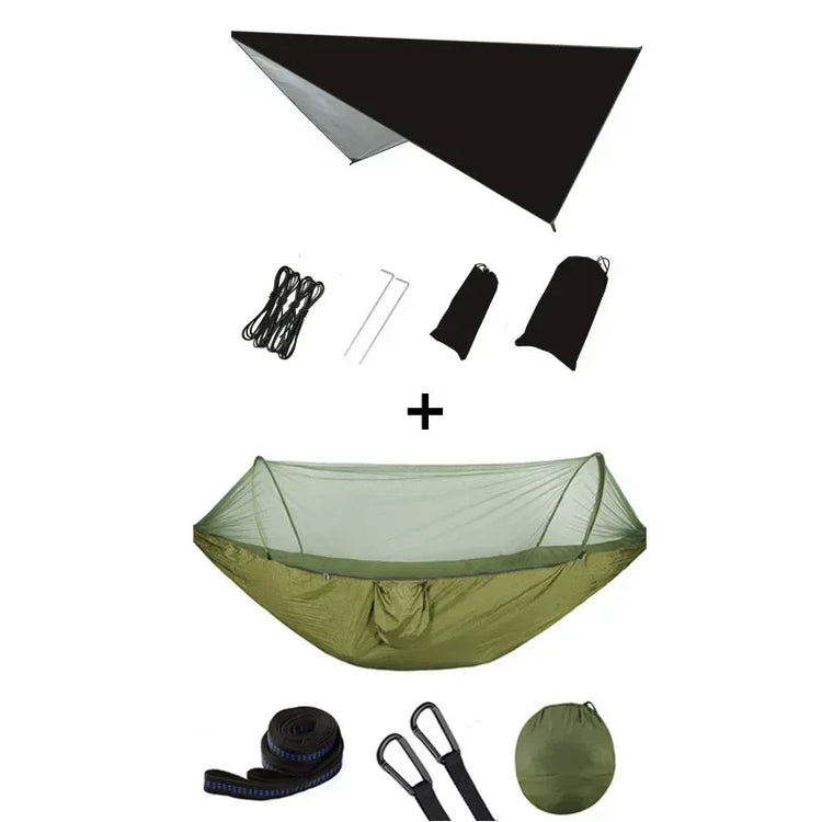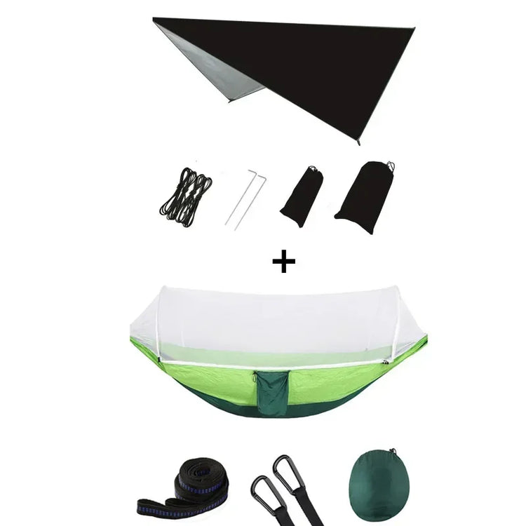 Our hammock has a unique pop-up frame and is completely knot-free, making it the easiest mosquito net hammock on the market to set up. It is perfect for camping, backpacking, hiking, travel, and other adventures!