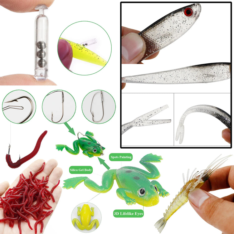 🎣2. Baits: This set has the most types of baits available on the market and can meet the fishing needs of different fishing enthusiasts. Baits are made of infectious PVC/plastic/silicone, etc. Wear resistant and corrosion-resistant, long-lasting.