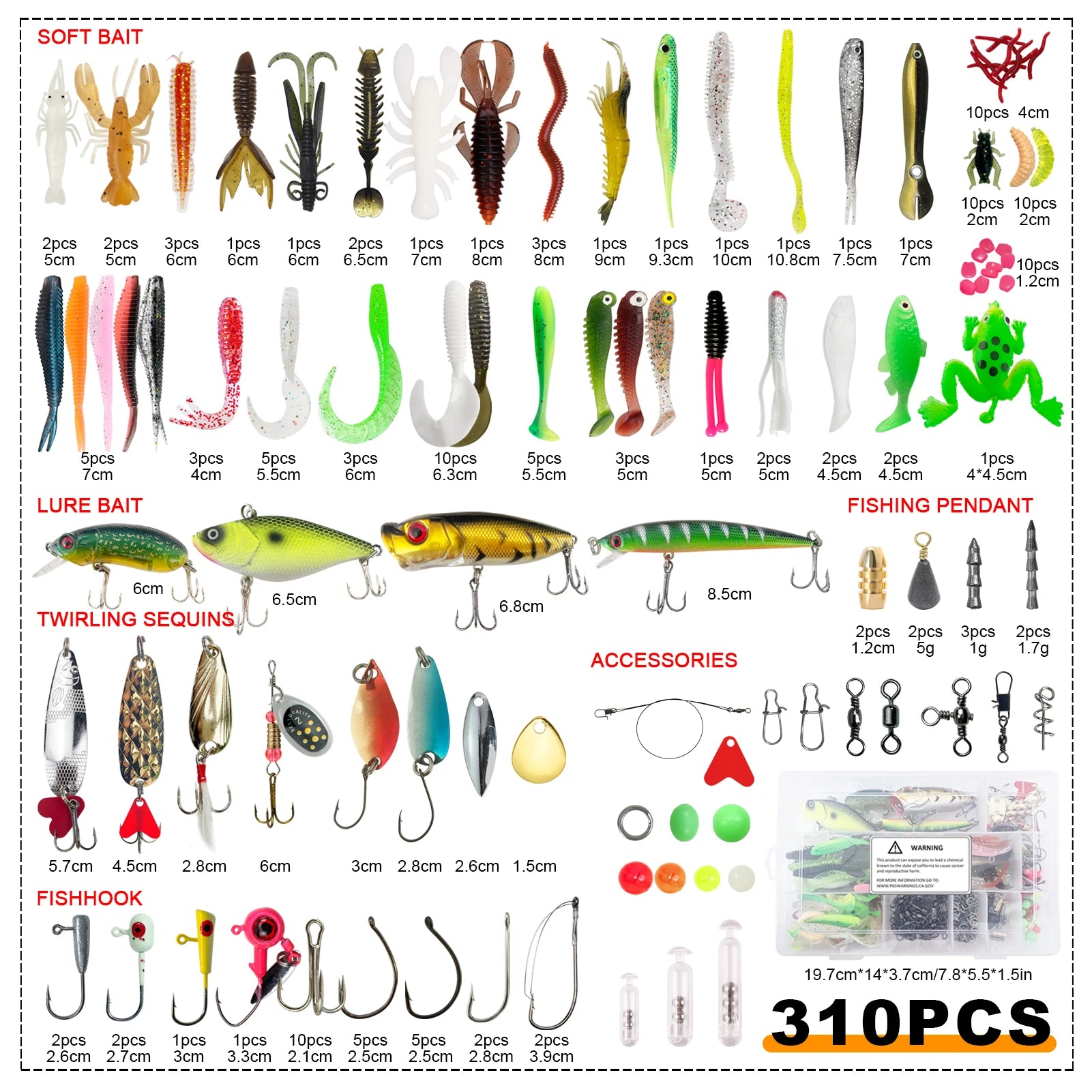 🎣1.310pcs Soft Bait+Accessories Set: 104pcs Different Types of Soft Bait+4pcs Hard Bait+8pcs Metal Bait (Spoons+Spinners)+30pcs Hook (Lead Head Hook+Single Hook+Three Anchor Hook, etc.)+154pcs Other Accessories (Beads+Lead Pendant+Connection Ring, etc.)+1pcs Plastic Fishing Gear Box.