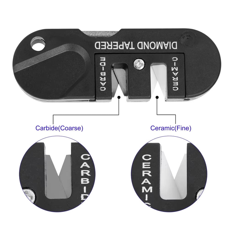 Specialy shaped ceramic slot to finish edges and sharpen serrated blades.