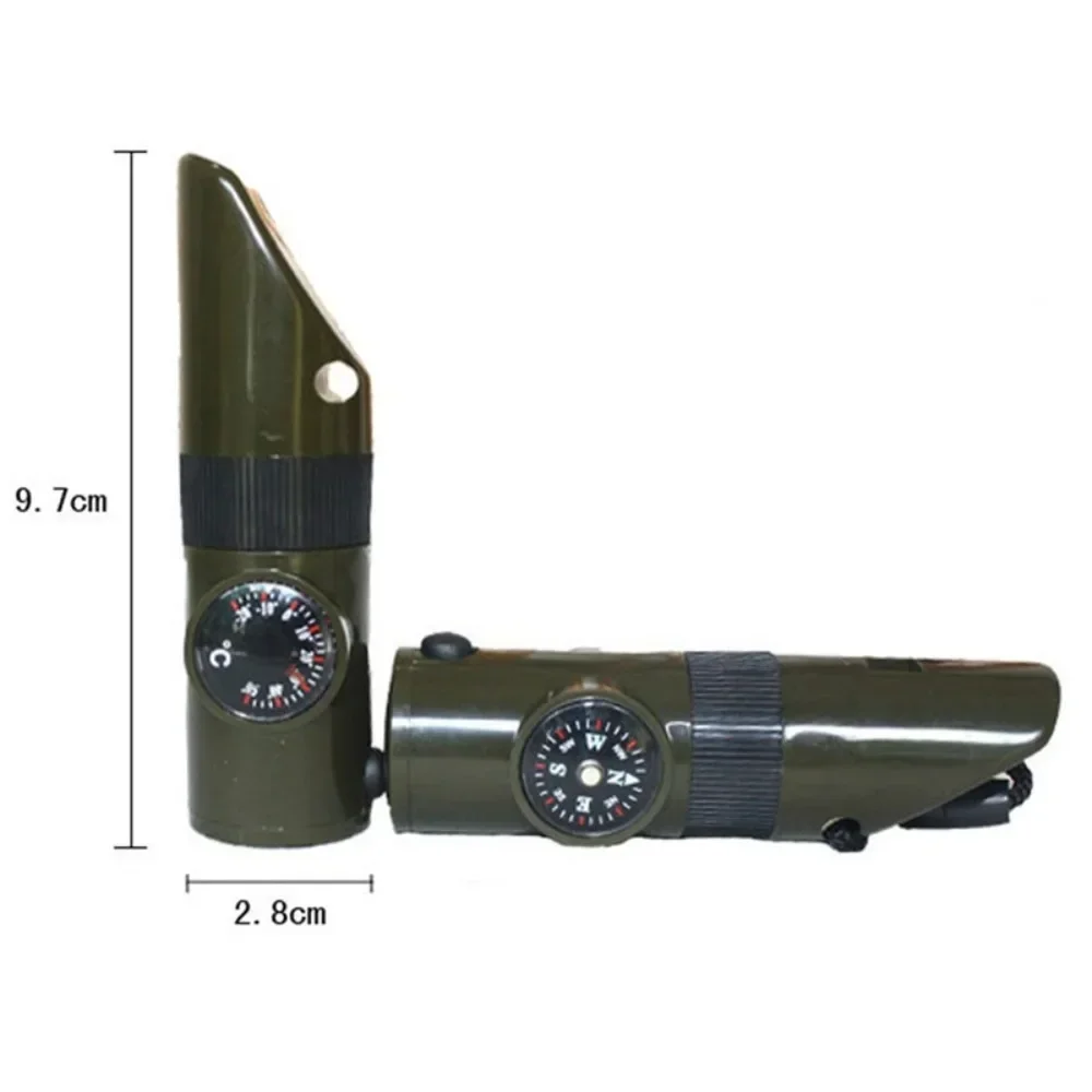 Functions: whistle, compass, thermometer, magnifying glass, reflector, led light, storage compartment